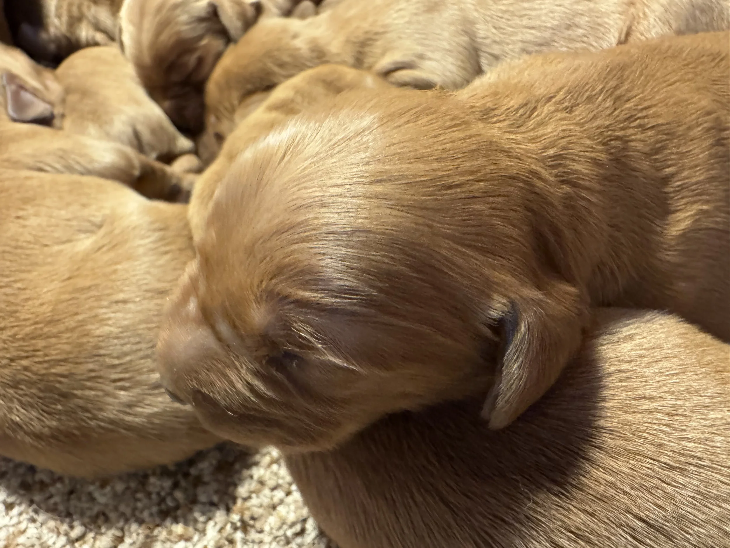 The photos show the Bettee x Maverick puppies at one week old. This wonderful bunch of puppies has been doing so incredibly well with Bettee as an incredible momma to support them. The puppies are immaculately soft and cuddly, which already shows just how loving these little sweethearts are. Their coats even show that gorgeous golden color, though they will darken some as they grow. We are looking forward to all the happiness they will surely bring!