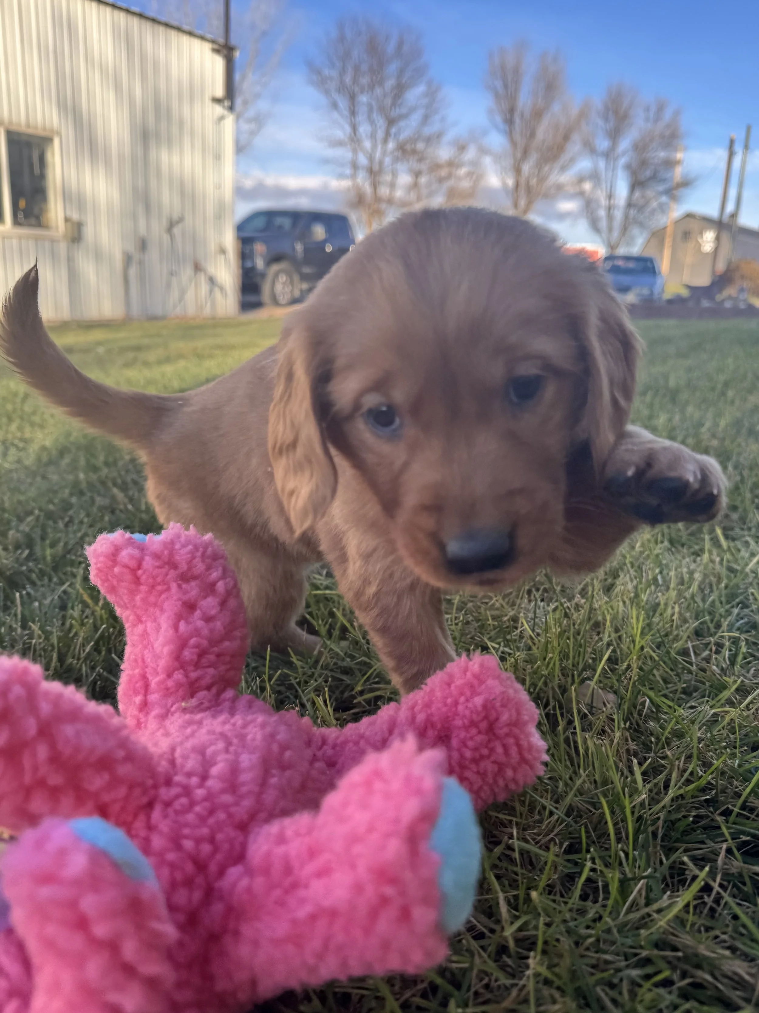 Female 7778 is one playful little sweetheart! She absolutely loves her toys, and took to the wing very quickly! She likes to stay close to her person and does a great job following them around. She even likes to run all around you, with her tail wagging the whole time! She even did very well around the cat.