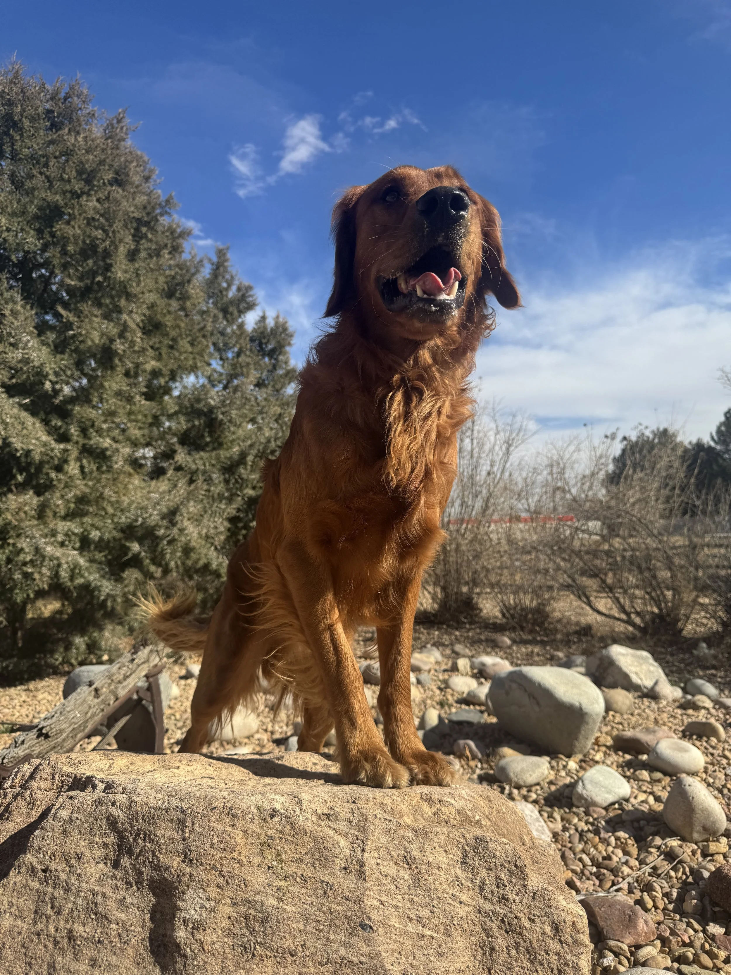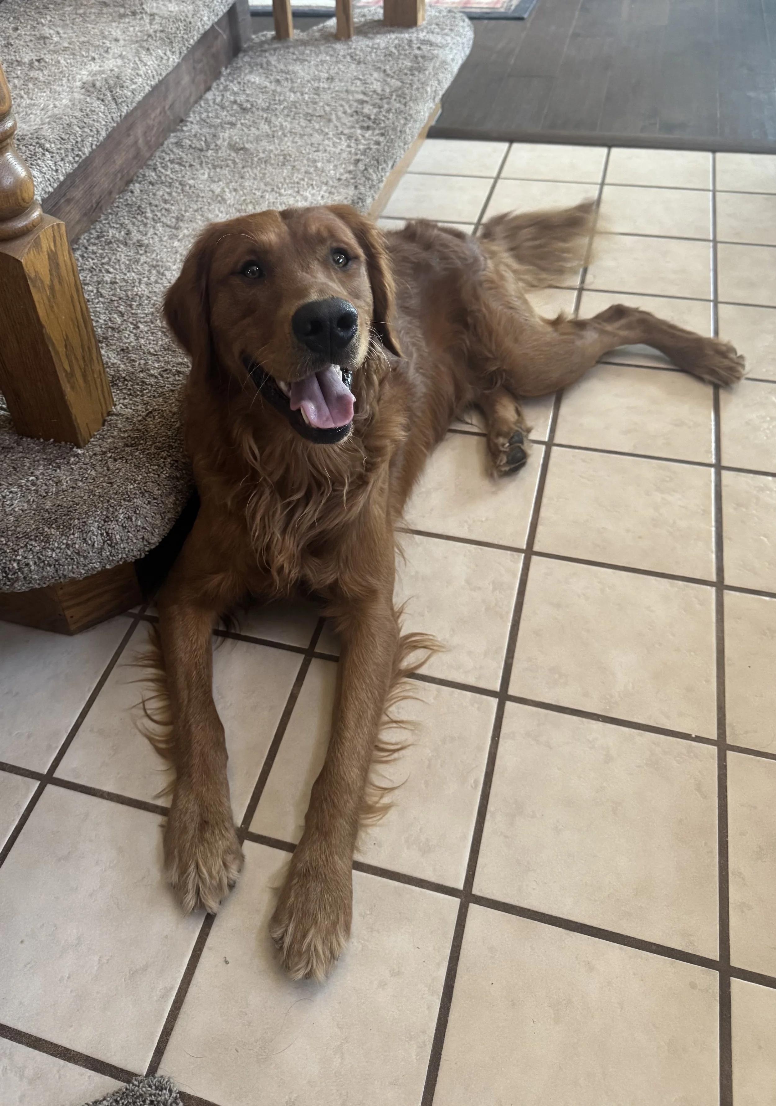Shooter’s beautiful, darker red coat is only bested by its softness and his adorably handsome face! His face shape is really starting to get more blockier, like his dad. He is currently on the smaller end for Golden Retriever males, but he may have a little more filling out to do as he grows.
